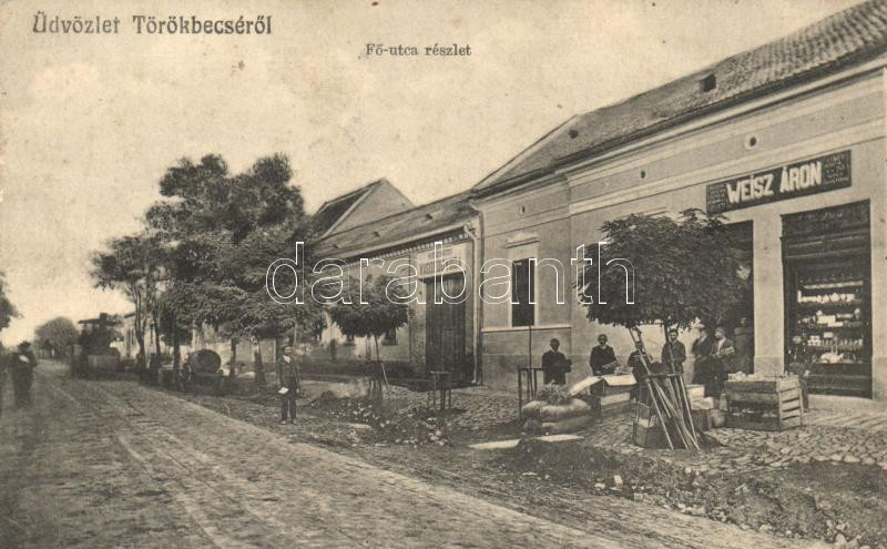 Leírás: Törökbecse, Fő utca, Weisz Áron üzlete, kisdedóvoda / main street, shop, kindergarten (EK)
