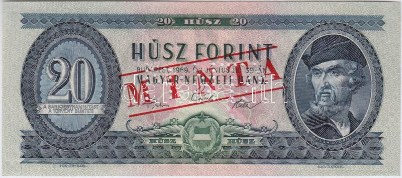 Hungary 1969. 20 Forint with "C 000 - 000752" serial number and with red "MINTA" (SPECIMEN) overprint and perforation C:UNC