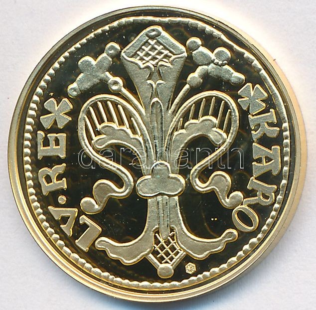 Leírás: DN "Magyar aranypénzek utánveretben - Károly Róbert aranyforint" aranyozott Ag emlékérem (5.5g/0.999/25mm) T:PP Tanúsítvánnyal