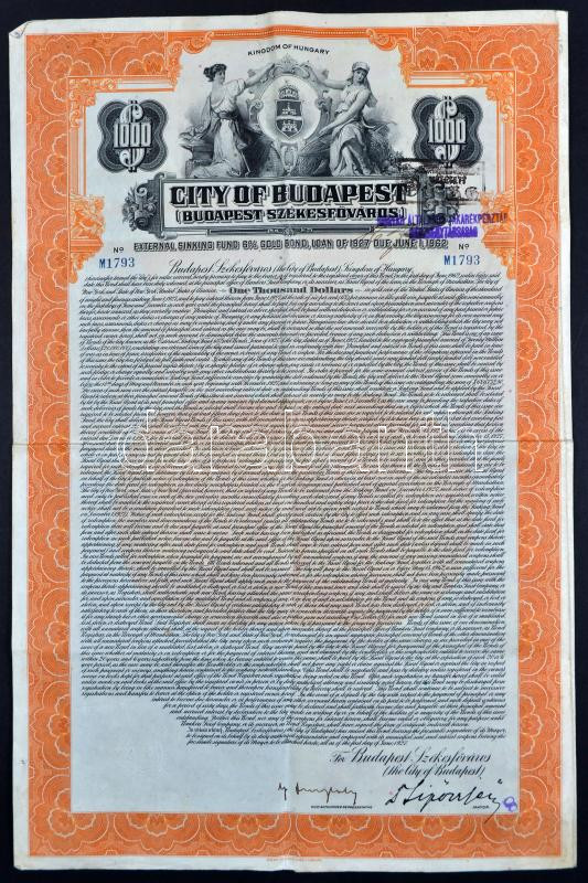 Leírás: 1927. "City of Budapest" kamatozó kötvény 1000$-ról, szelvényekkel, Sipőcz Jenő főpolgármester saját kezű aláírásával T:III