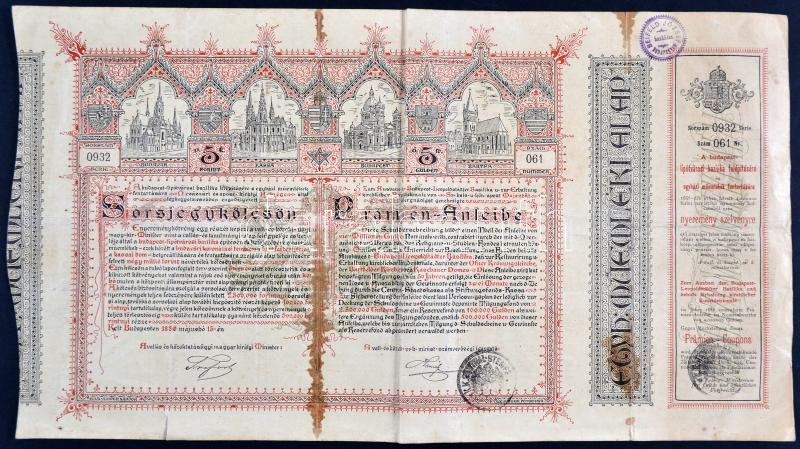 Budapest 1886. "Egyházi Műemlék Alap" Sorsjegykölcsöne 5Ft-ról a budapest-lipótvárosi bazilika kiépítésére s egyházi műemlékek fenntartására T:III (foltos)