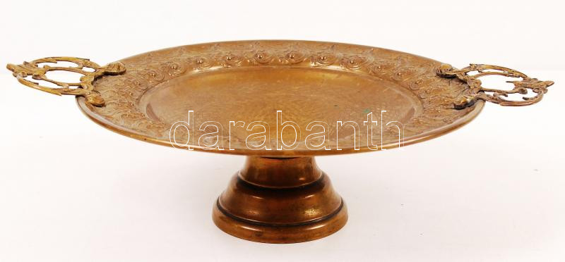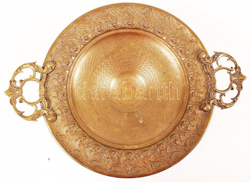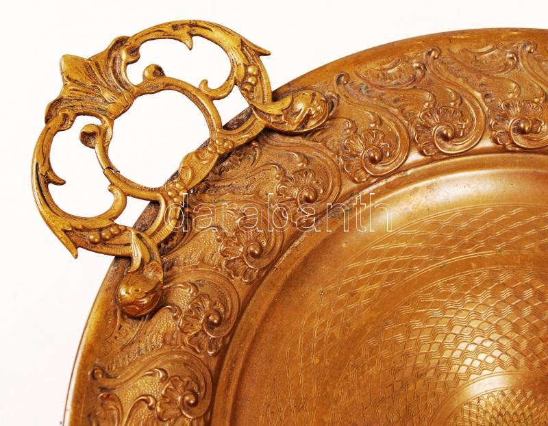 Leírás: Antik gazdagon díszített réz kínálótál, m:9 cm, 34×26 cm