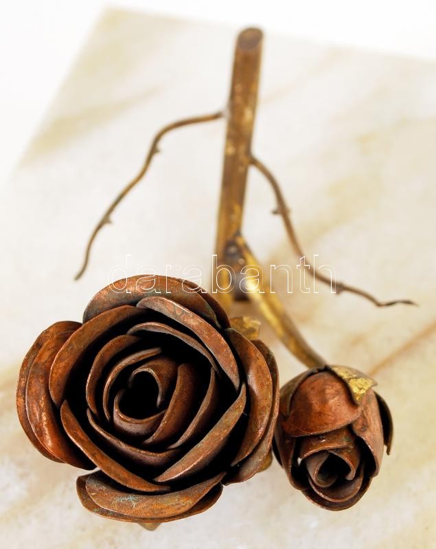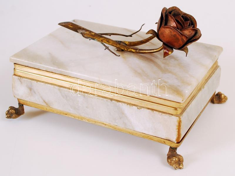 Leírás: Réz keretes márvány doboz tetején rózsa díszítéssel, 15x10x6 cm