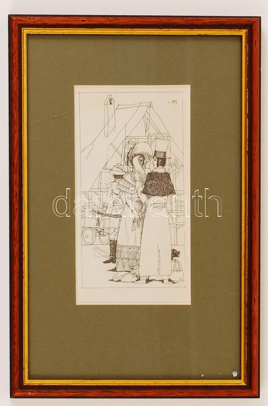 Leírás: Kondor Béla (1931-1972): Illusztráció. Rézkarc, papír, jelzés nélkül, üvegezett keretben, 15×8 cm
