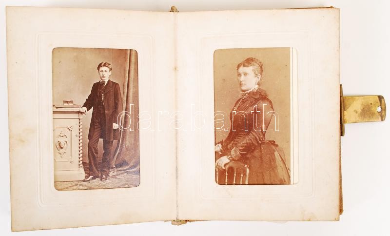 Leírás: cca 1860-1880 Jó házból való férfiak és nők vizitkártya gyűjteménye különböző magyar fotósok műtermeiből, szép állapotú, rézcsatos fényképalbumban