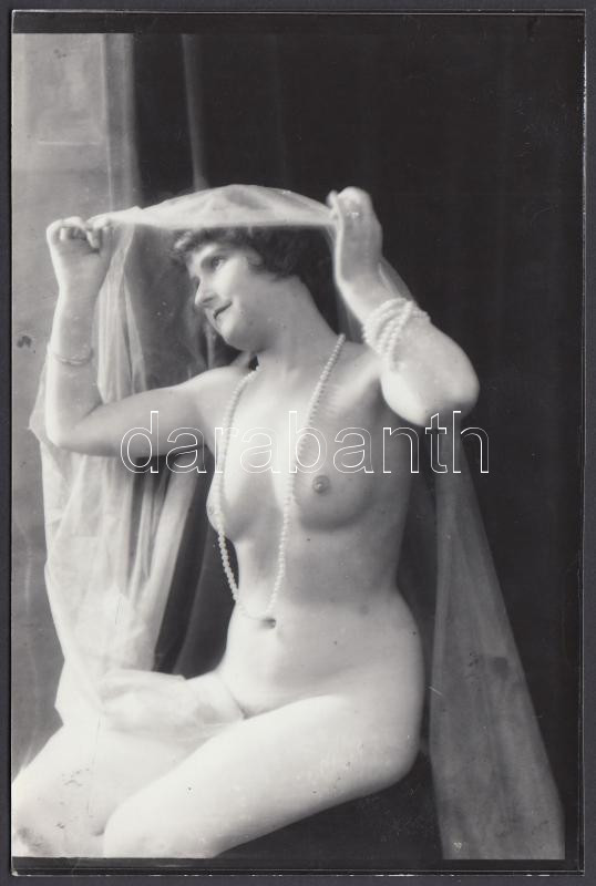 cca 1925-1930 Demeter Károly (1892-1983) párizsi korszakában készült finoman erotikus fénykép fátyollal, nyaklánccal, jelzetlen későbbi kontakt másolat a hagyatékból, 12x18 cm