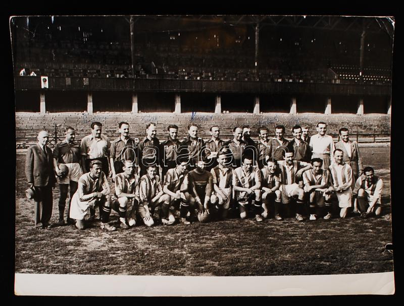 cca 1946-1947 Magyar Kommunista Párt- Nemzeti Paraszt Párt futball mérkőzés az Üllői úton fotó olyan játékosokkal, mint: Kádár, Széll, Apró, Köböl. Képen tintával nevek láthatóak. 18x24