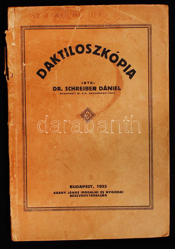 Schreiber Dániel dr. : Daktiloszkópia. Bp., 1925, Arany János Irodalmi és Nyomdai Részvénytársaság. Számos szövegközti rajzzal, fényképpel, kihajtható ujjnyomatlappal illusztrálva. Kiadói papír kötésben. A fedőlap viseletes.