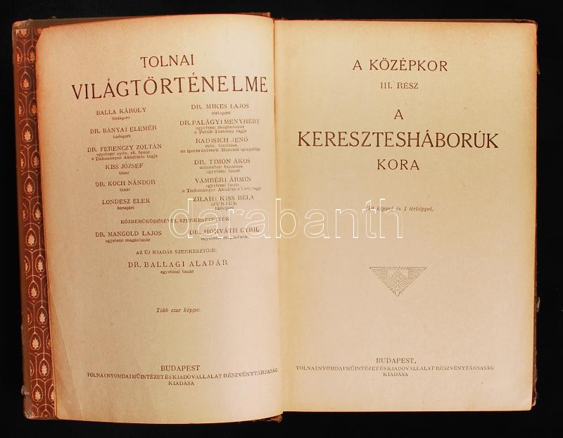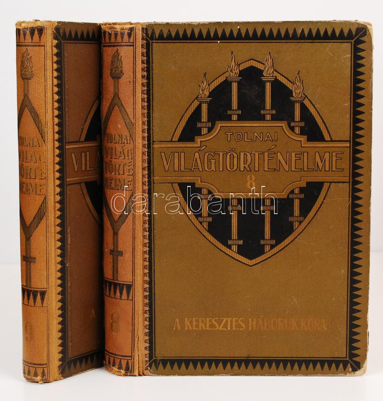 Dr. Ballagi Aladár(szerk.): Tolnai Világtörténelme VIII-IX. kötet. A középkor III-IV. rész. Bp., Tolnai Nyomdaműintézet és Kiadóvállalat Részvénytársaság. Kiadói festett félvászon kötés, belül a gerincnél kissé levált, kopottas állapotban.