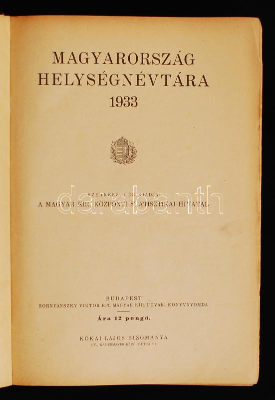 A Magyar Kir. Központi Statisztikai Hivatal (szerk.): Magyarország helységnévtára 1933. Budapest, 1933, Hornyánszky Viktor R.-T. Magyar Kir. Udvari Könyvnyomda.Kiadói vászonkötésben. A gerinncnél szakadt.