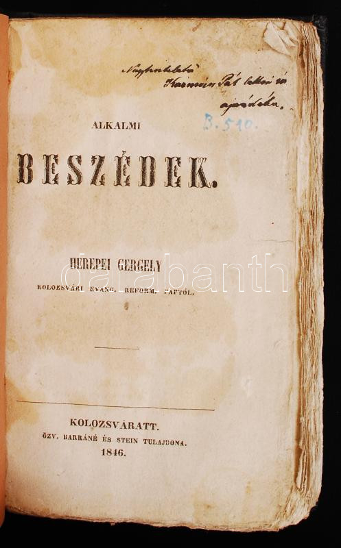 Herepei Gergely: Alkalmi beszédek. Kolozsvár, 1846, Özv. Barráné és St... https://www.darabanth.com/hu/221-Gyorsarveres/221.0/Festmeny-mutargy-papirregiseg-egyeb/Konyvek-Vallas~1600036/Herepei-Gergely-Alkalmi-beszedek-Kolozsvar-1846-Ozv-Barrane-es-Stein-Kesobbi-borkotC3~II954412