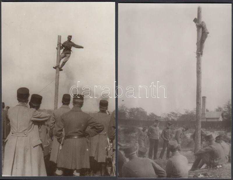 cca 1914-1918 Távíró és telefon oszlop szerelése, bemutató híradós katonáknak, ismeretlen katona negatívokból álló hagyatékának későbbi feldolgozása, 2 db fénykép, 14x9 cm