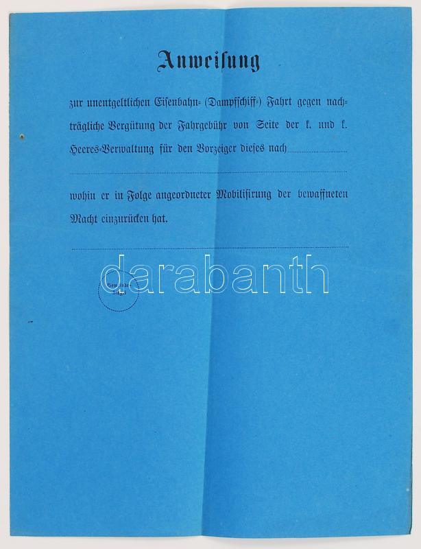cca 1914 Császári és királyi hadsereg részére kiállított kitöltetlen u... https://www.darabanth.com/hu/221-Gyorsarveres/221.0/Festmeny-mutargy-papirregiseg-egyeb/Militaria~1600005/cca-1914-Csaszari-es-kiralyi-hadsereg-reszere-kiallitott-kitoltetlen-utazasi-utalvany-vas~II948615