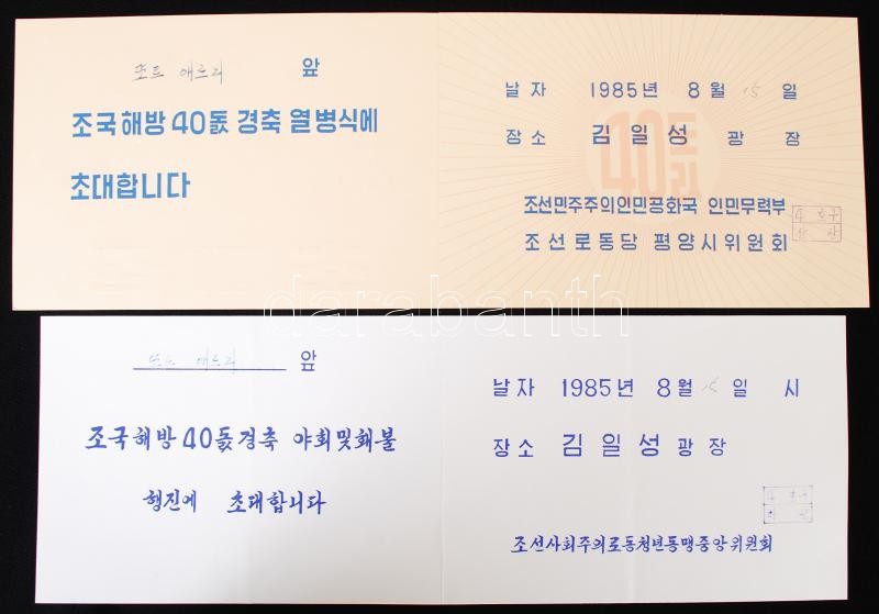 Leírás: 1985 Észak-Korea fennállásának 40. évfordulójára kiadott 2 db nyomtatvány