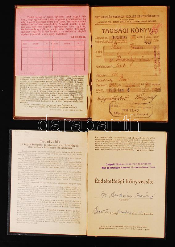Leírás: 1918-1944 Csepeli Hitel és Takarékszövetkezet érdekeltségi könyvecske, Magyarországi Munkások Rokkant- és Nyugdíjegyletének tagsági könyve