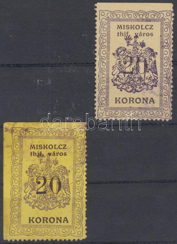 Leírás: 1921 Miskolc városi illetékbélyeg 2 x 20K, egyik kréta papíron, másik sötét sárga színű