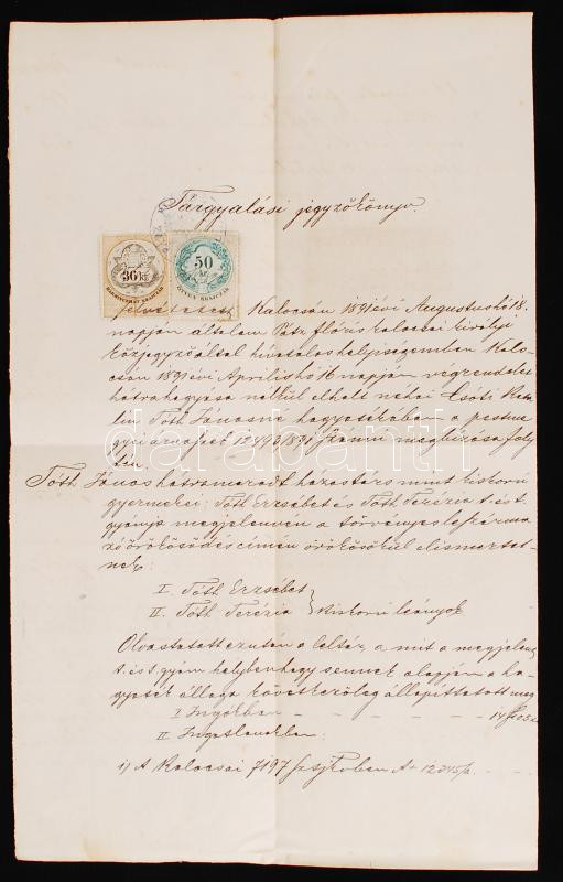 1891 Tárgyalási jegyzőkönyv 36kr + 50kr okmánybélyeggel https://www.darabanth.com/hu/221-Gyorsarveres/221.0/Festmeny-mutargy-papirregiseg-egyeb/Okmanyok~1600151/1891-Targyalasi-jegyzokonyv-36kr-plus-50kr-okmanybelyeggel~II955655