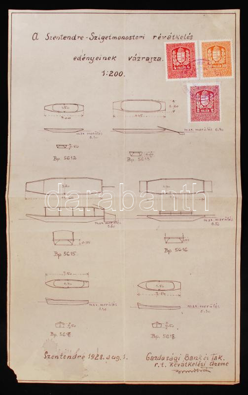 Leírás: 1928 A Szentendre - Szigetmonostori révátkelés edényeinek vázrajza okmánybélyegekkel
