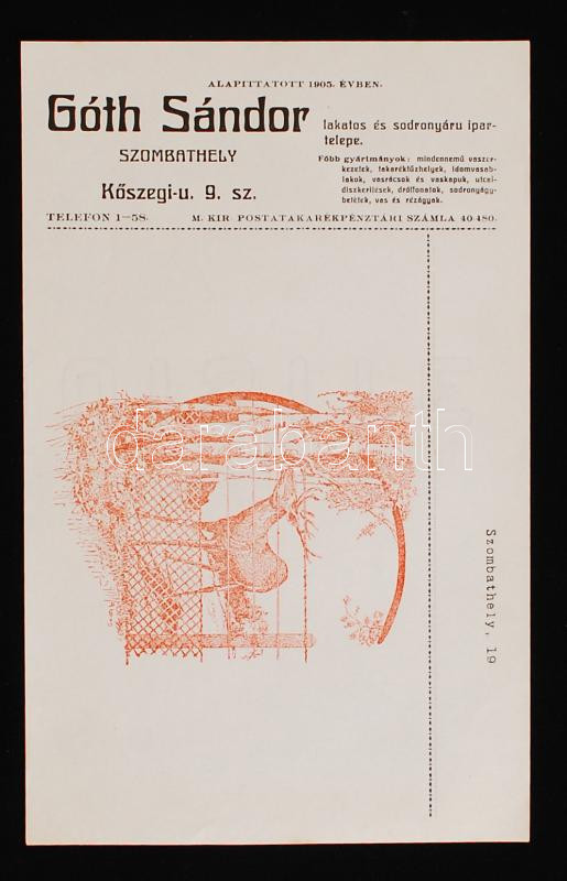 Góth Sándor lakatos és sodronyárú ipartelepe, Szombathely, számoló céd... https://www.darabanth.com/hu/221-Gyorsarveres/221.0/Festmeny-mutargy-papirregiseg-egyeb/Reklam~1600029/Goth-Sandor-lakatos-es-sodronyaru-ipartelepe-Szombathely-szamolo-cedula-cca-1940~II953499