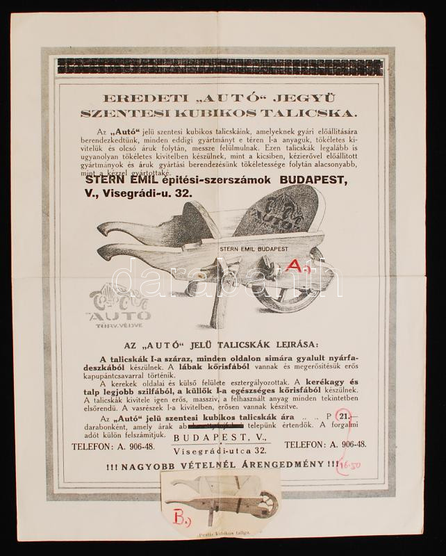 Leírás: cca 1920-1930 Bp.V., Stern Emil építési-szerszámkereskedésének kubikos talicskát reklámozó szórólapja