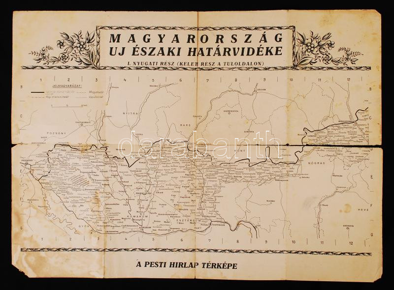 cca 1938 Magyarország uj északi határvidéke. A Pesti Hirlap térképe. Korabeli térkép az I. bécsi döntéssel visszacsatolt területekről, 41x58cm (hajtás mentén szakadozott és egy-két folttal)