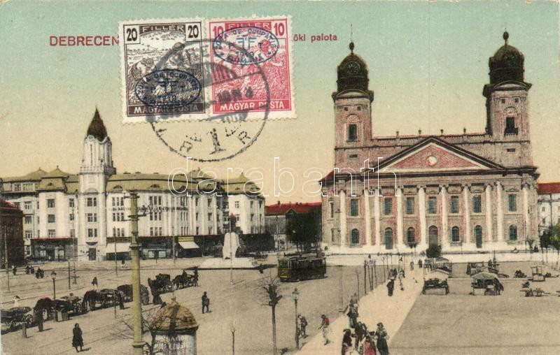 Leírás: Debrecen, Református nagytemplom, püspöki palota, villamos, Bottó Kornél üzlete