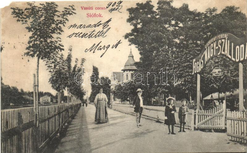 Leírás: Siófok, vasúti korzó, Cserveny Ferenc Fogas Nagyszálloda, kiadja Breuer Mór (EM)
