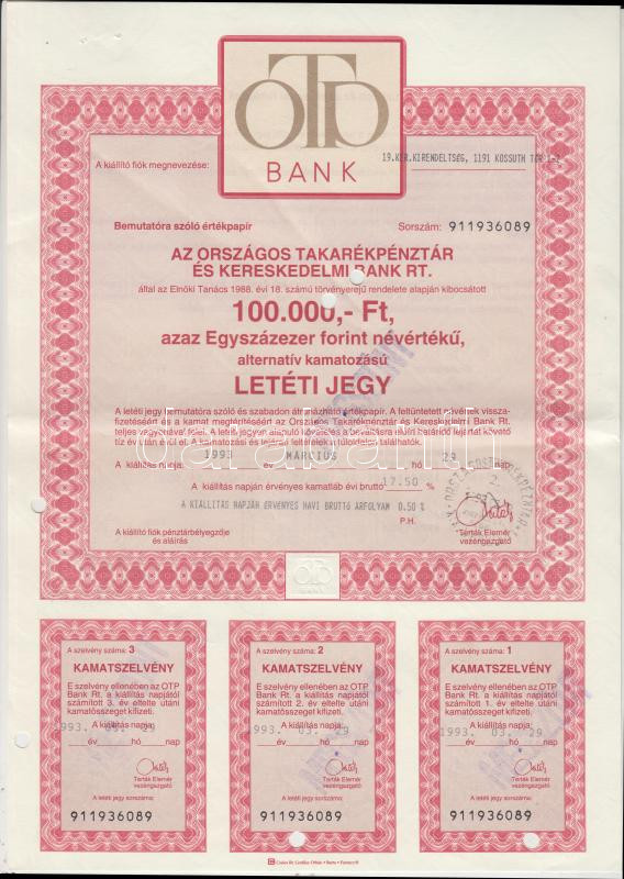 Leírás: Budapest 1993. "OTP Bank" letéti jegye 100.000Ft-ról szelvényekkel, bélyegzésekkel, lyukasztással érvénytelenítve T:II