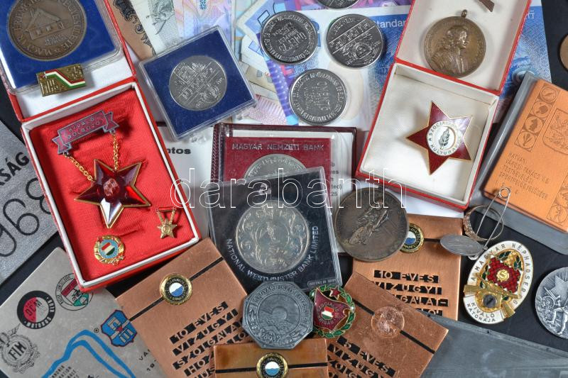 Leírás: Doboznyi vegyes szocialista kitüntetés, jelvény, emlékérem, külföldi bankjegy, sportérem tétel, közte zománcozott és tokos darabok is T:vegyes