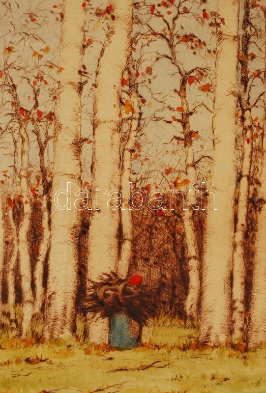 Leírás: Csillag József (1894-1977): Nyíres. Színezett rézkarc, papír, jelzett, 23×17 cm