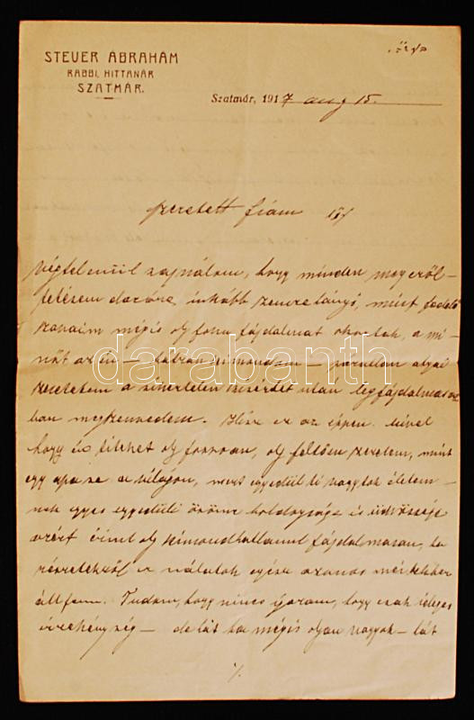 1912 Steuer Ábrahám szatmári rabbi saját kézzel írt levele / Rabbi fro... https://www.darabanth.com/hu/222-Gyorsarveres/222.0/Festmeny-mutargy-papirregiseg-egyeb/Judaika~20002/1912-Steuer-Abraham-szatmari-rabbi-sajat-kezzel-irt-levele-Rabbi-from-Satu-Mare-autograph-le~II930667