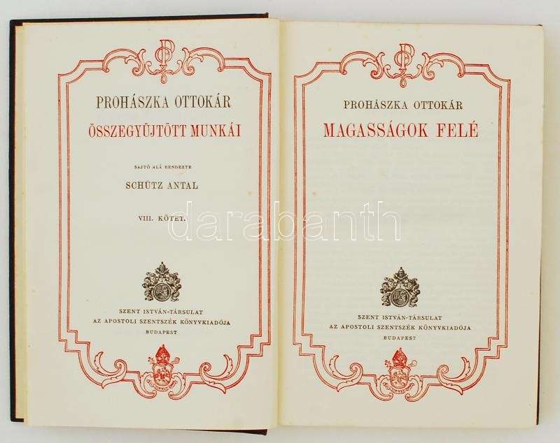 Prohászka Ottokár Összegyűjtött munkái: Magasságok felé. VIII. kötet. Budapest, 1928, Szent István- Társulat az Apostoli Szentszék könyvkiadója. Gyűjteményes díszkiadás. Kiadói egészvászon kötésben. Jó állapotú.