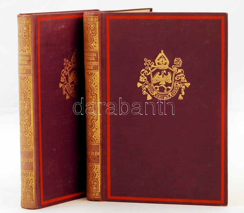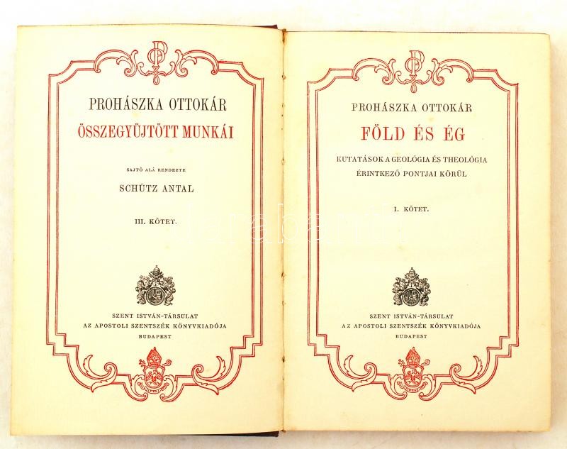 Prohászka Ottokár Összegyűjtött munkái:Föld és ég. Kutatások a geológia és theológia érintkező pontjai körül. I-II. kötet. Budapest, 1927, Szent István- Társulat az Apostoli Szentszék könyvkiadója. Gyűjteményes díszkiadás. Kiadói egészvászon kötésben. Jó állapotú.