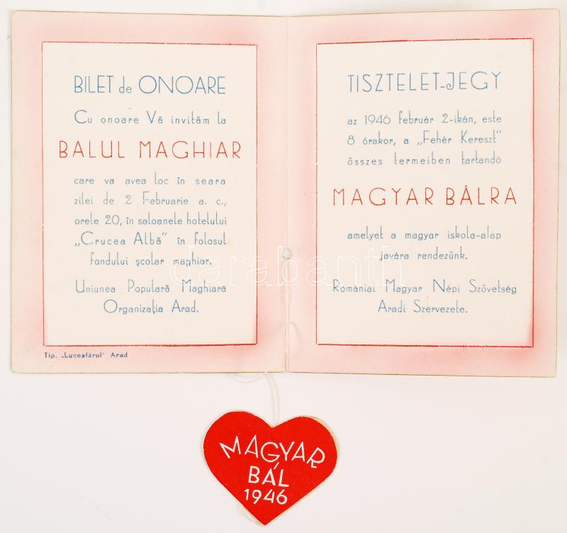 Leírás: 1946 Tiszteletjegy a Romániai Magyar Népi Szövetség Aradi Szervezete által rendezett magyar bálra