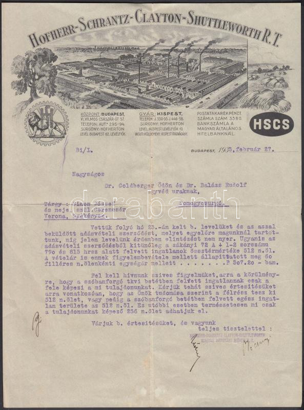 1933 Bp., Hofherr-Schrantz-Clayton-Shuttleworth R.T. levele díszes fej... https://www.darabanth.com/hu/222-Gyorsarveres/222.0/Festmeny-mutargy-papirregiseg-egyeb/Reklam~20033/1933-Bp-Hofherr-Schrantz-Clayton-Shuttleworth-RT-levele-diszes-fejleces-papiron~II963556