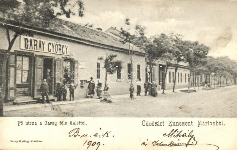 Kunszentmárton, Fő utca, Garay György üzlete és kiadása (EK) https://www.darabanth.com/hu/222-Gyorsarveres/222.0/Kepeslapok/Magyarorszag~10006/Kunszentmarton-Fo-utca-Garay-Gyorgy-uzlete-es-kiadasa-EK~II963119