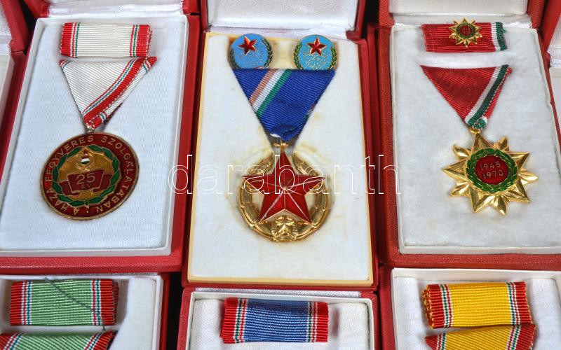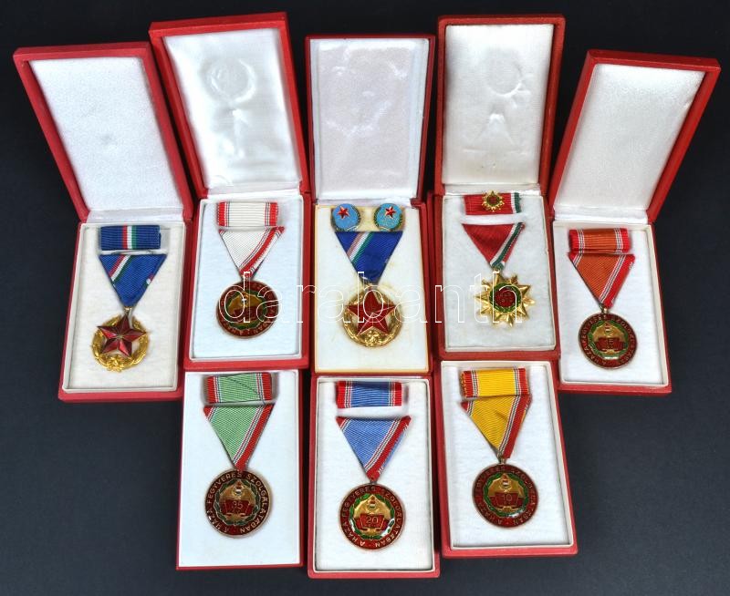 8db szocialista kitüntetés, mindegyik dÃsztokban, benne "Közbiztonsági Érem", "Felszabadulási Jubileumi Emlékérem", "A Haza Fegyveres Szolgálatában" kitüntetések T:vegyes