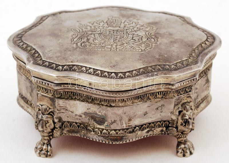 Leírás: Ékszeres doboz Nagy Britannia címerével, "Dieu et mon droit" felirattal, fém, 15×13 cm