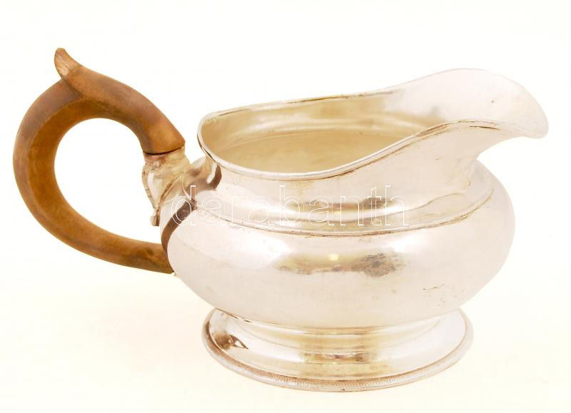 Leírás: Ezüstözött alpakka mártás kiöntő, fa fogantyúval, jelzett, m: 9,5 cm
