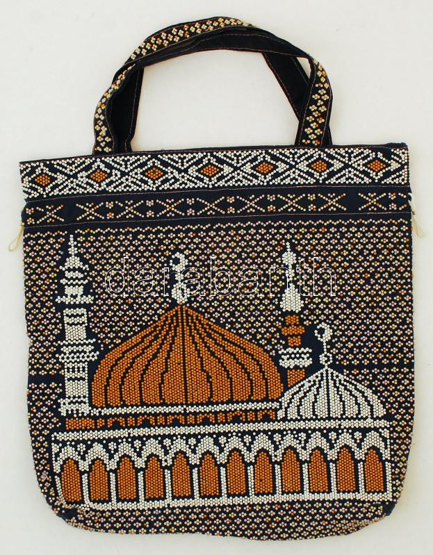 Leírás: Gyöngyökkel kivarrt vászontáska, mecset képével és nonfigurális motívumokkal