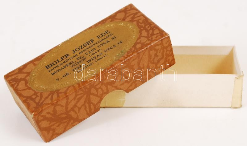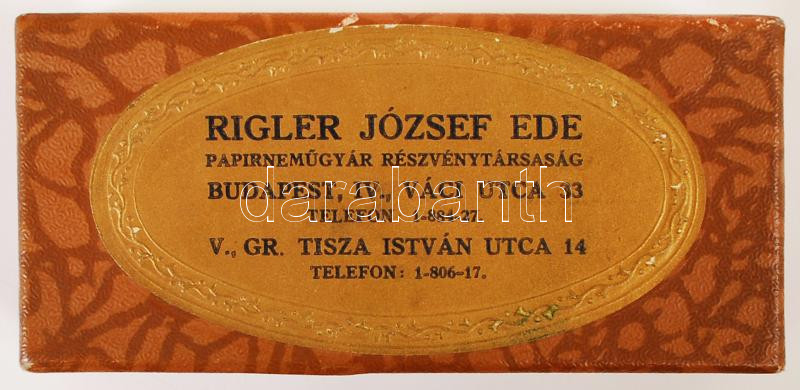 Leírás: Régi "Riegler József Ede Papírneműgyár RT." feliratú karton dobozka, belül ragasztott, 5×10 cm