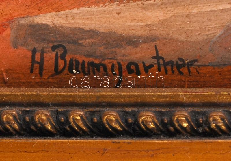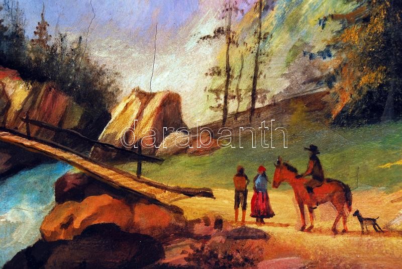 Leírás: Baumgartner jelzéssel: Találkozás a hídnál. Olaj, vászon, repedezett, antik keretben, 30×45 cm