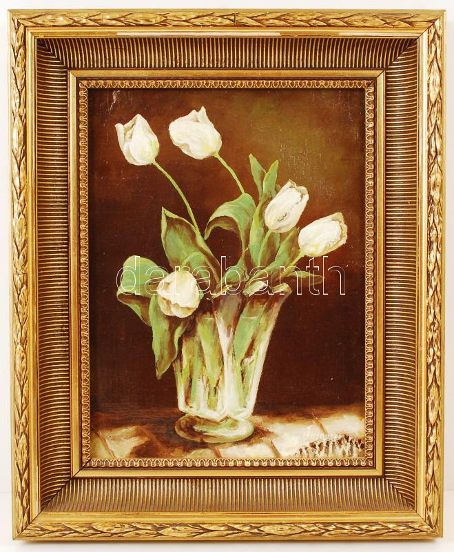 Leírás: Losonczi jelzéssel: Fehér tulipánok. Olaj, vászon, sérült keretben, 40×30 cm