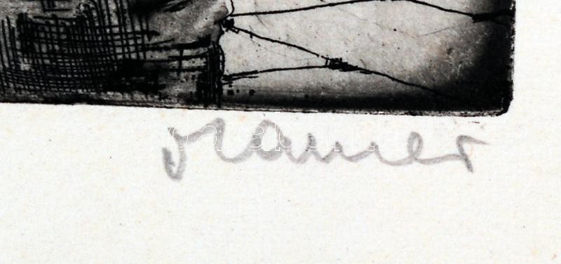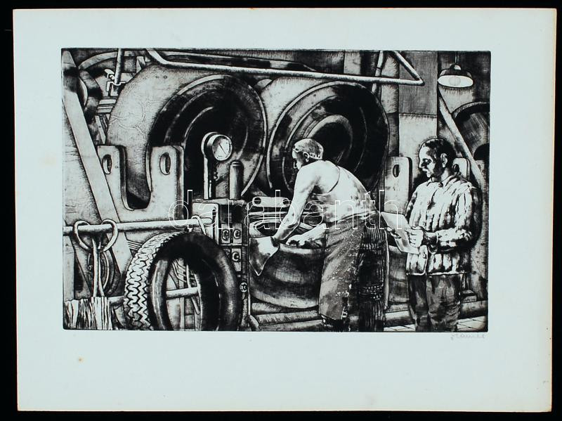 Leírás: Maurer Dóra (1934-): Gumigyár. Rézkarc, papír, jelzett, 19×29 cm