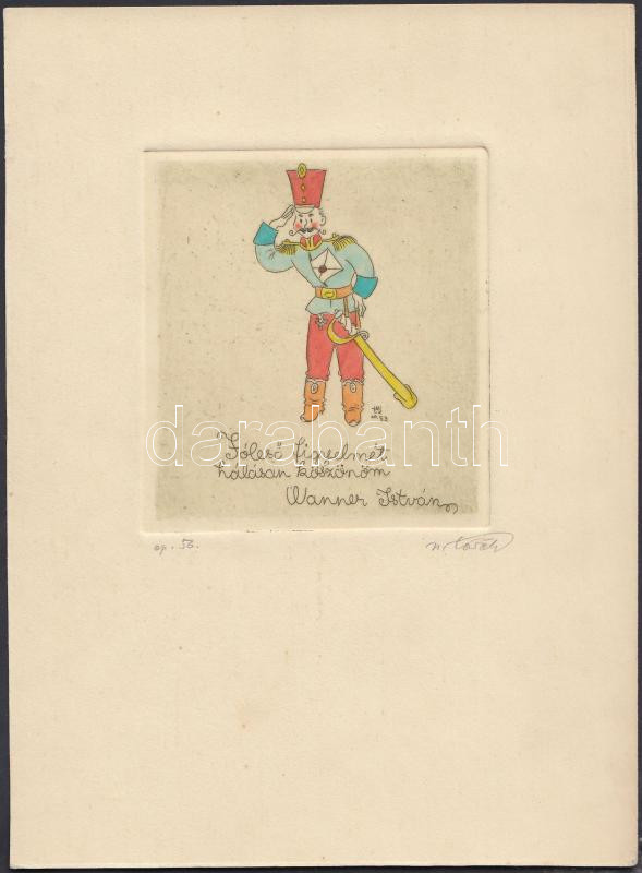 Leírás: Nemes Török János (1900?-1980): Jóleső figyelmét hálásan köszönöm. Színezett rézkarc, papír, jelzett. 7,5x7cm