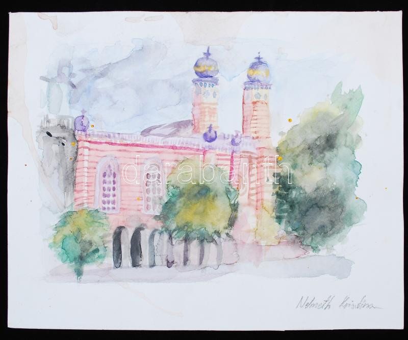 Leírás: Németh Krisztina (1994-): A Dohány utcai zsinagóga. Akvarell, papír, jelzett, 23×28 cm