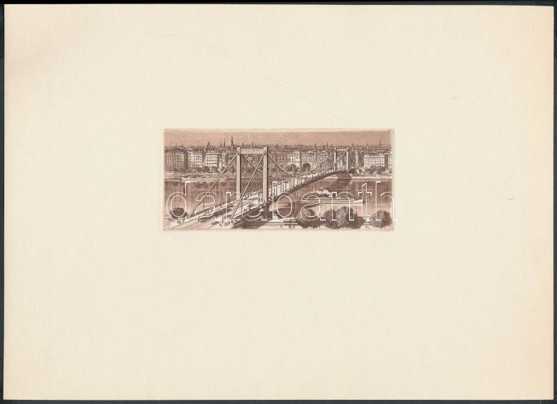 Leírás: Vagyóczky Károly (1941-) alkalmazott grafikus, bélyegtervező, számos forint bankjegy tervezője: Erzsébet híd. Rézkarc, jelzett a karcon. 5x11,5cm