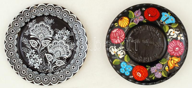 Vegyes kerámia-porcelán tétel: 1 db Hollóházi porcelán falióra, kézzel festett, jelzett, működik, d: 26 cm + 1 db "Magyarország-Csehszlovákia 1978" feliratú Hollóházi porcelán korong, matricás, jelzett, d: 8,5 cm + 2 db népi motívumos kerámia fali tál, jelzett, d: 23-23,5 cm + 1 db emberi fejet mintázó kis méretű kerámia kiöntő kancsó, jelzés nélkül, m: 8,5 cm + 1 db népi motívumos, kakast formázó porcelán kis teáskancsó, jelzett, m: 13,5 cm