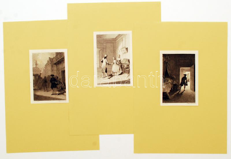 Leírás: 3 db rézkarc: Felix Augustin Milius (1843-1894): Rokokó jelenetek, rézkarc, papír, különféle méretekben