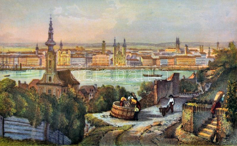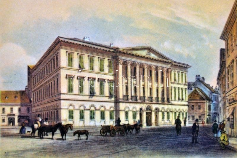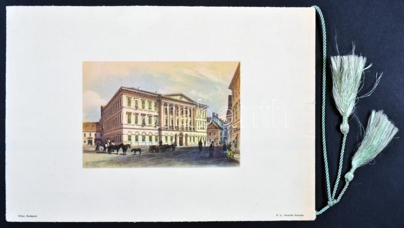 Leírás: Budapest egykori látképe, litho. A vármegyeháza, a Pesti hazai első Takarékpénztár-Egyesület első otthona, díszes kiadvány. 12x19cm